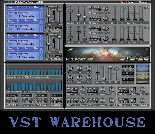 STS-26 comes with a new set of 128 waveforms + 21 percussion loops for low octave loop play (LOP) as part of the synth sound. Also two Contour Generators have been added which can be drawn by mouse in realtime thus rather complex LFO-waves can be done.